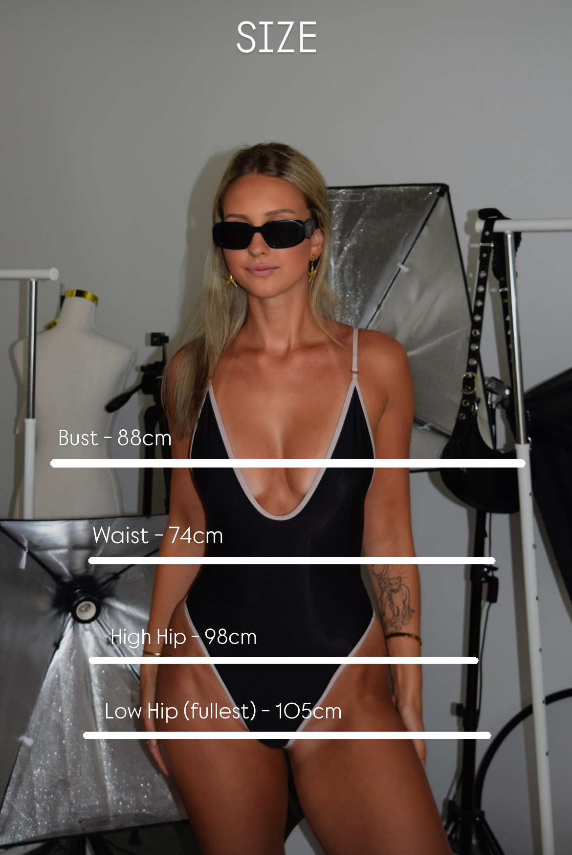 Sophie wears size S and is 173cm tall / 84cm bust / 64cm waist / 90cm hips.]